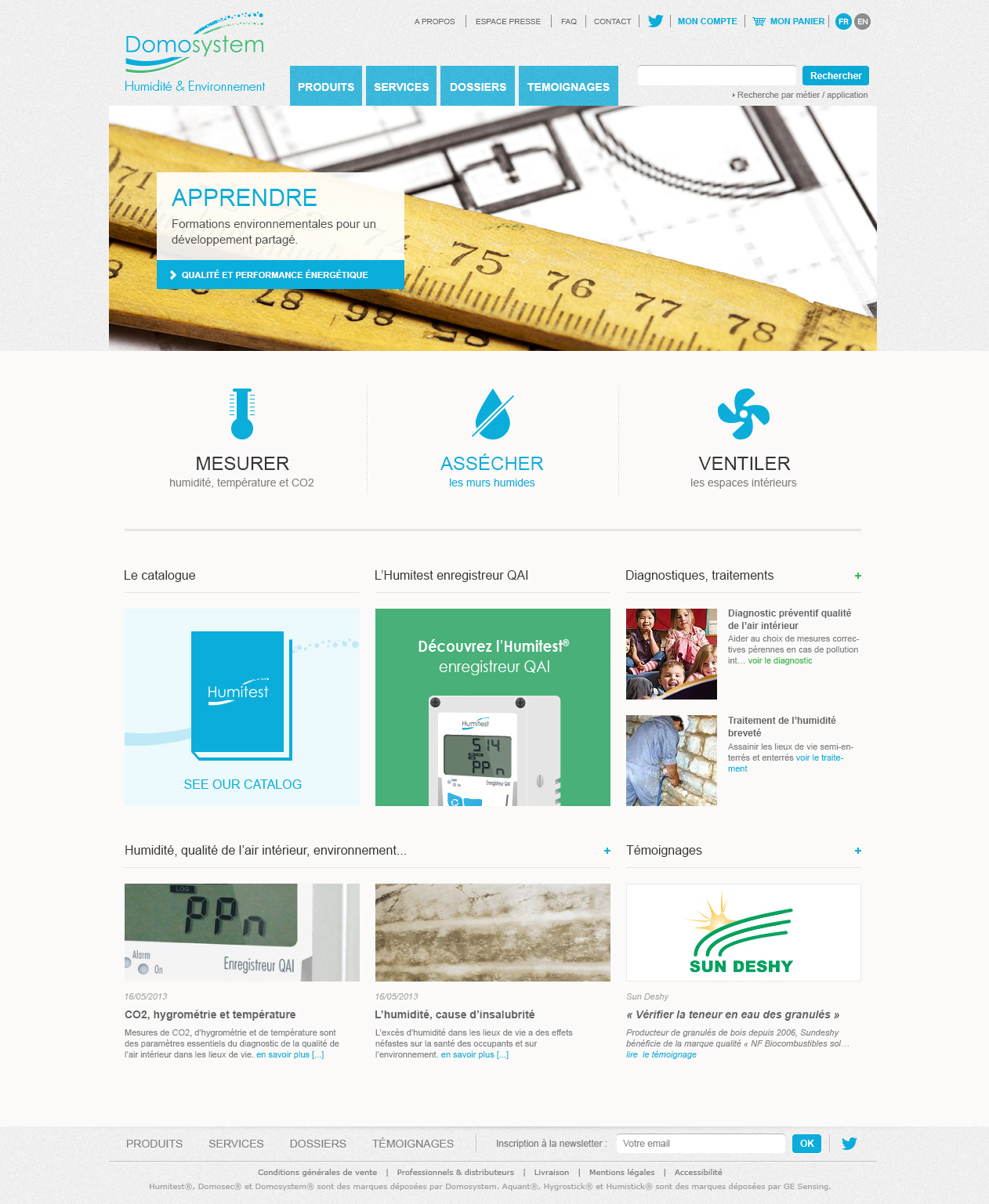 Domosystem.fr est un site e-commerce, mais a aussi pour but d’informer, de conseiller sur les produits et services proposés à travers des dossiers traitant de l’humidité et de l’environnement. Le catalogue produits de Domosystem compte une cinquantaine de références