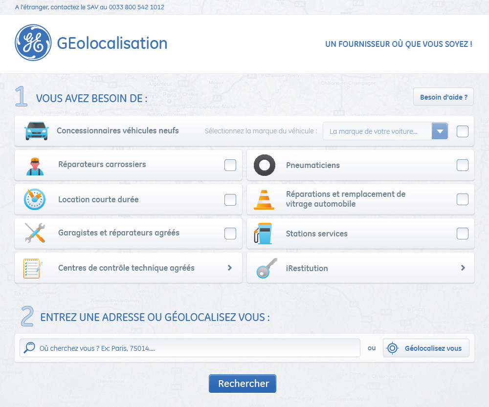 gelocalisation.gecapital.fr est un moteur de recherche permettant au personnel de la société GE Capital Fleet Services de trouver rapidement des fournisseurs automobiles aux alentours pour effectuer diverses prestations. Une fois les critères sélectionnés, les fournisseurs sont géolocalisés sur une carte Google maps et chaque fournisseur possède sa propre fiche. Les utilisateurs ont accès aux coordonnées du fournisseur sur cette fiche. Ils ont également la possibilité de partager ces coordonnées par mail ou sms, de laisser un avis sur le fournisseur mais aussi d’imprimer la fiche.